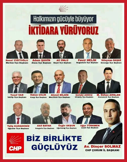 - CHP Çorum Örgütü'nde 27 Eylül 2025'de Oğuzlar İlçesi ile başlayan ilçe kongreleri bugün yapılan 7 Ilçe kongresi ile tamamlandı. Ve gözler 19 Ekim'de yapılacak 39. Olağan İl Kongresine çevrildi.
