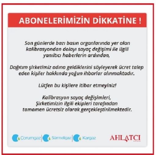 Son günlerde sayaç değişimi iddiasıyla kapı kapı dolaşan kişilere dair şikayetlerin artması, doğalgaz dağıtım şirketlerini harekete geçirdi. Çorumgaz, Sürmeligaz ve Kargaz, abonelerin para talep eden kişilere karşı dikkatli olması gerektiğini açıkladı. Son günlerde bazı basın organlarında yer alan “kalibrasyon nedeniyle sayaç değişimi” haberleri sonrası Çorumgaz, Sürmeligaz ve Kargaz abonelerinden gelen şikâyetler artınca şirketlerden önemli bir uyarı yayınlandı. Dağıtım şirketleri, abonelerin kapılarına giderek şirket adına işlem yaptığını söyleyip ücret talep eden kişilere karşı dikkatli olunması gerektiğini duyurdu.