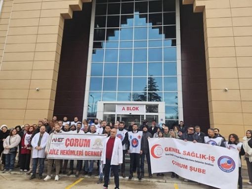 Çorum Aile Hekimleri Derneği (ÇAHED) Başkanı Dr. Mesut Yetkin, Çorum İl Sağlık Müdürlüğü önünde yaptığı basın açıklamasında, aile hekimliği sisteminde uygulanan performans ve ücret kesintilerine tepki gösterdi. Türkiye genelinde 81 ilde eş zamanlı yapılan basın açıklamalarının bir parçası olduklarını belirten Dr. Yetkin, aile hekimleri ve aile sağlığı çalışanlarının son dönemde ağır bir iş yükü ve gelir kaybıyla karşı karşıya bırakıldığını ifade etti. Son bir yıl içerisinde Aile Sağlığı Merkezlerine (ASM) başvurmayan nüfus üzerinden ücret kesintilerinin başlatıldığını söyleyen Yetkin, bu durumun sorumluluğunun yalnızca aile hekimlerine yüklendiğini dile getirdi. Objektif kriterlere dayanmayan memnuniyet uygulamaları nedeniyle hekim ve sağlık çalışanlarının gelirlerinde ciddi kesintiler yaşandığını vurgulayan Dr. Yetkin, “Aile hekimleri ve aile sağlığı çalışanları yıpratıcı bir performans sisteminin baskısı altındadır. Günlük 80’i aşan poliklinik sayılarına rağmen, binlerce verinin sisteme girilmesi beklenmektedir” dedi.