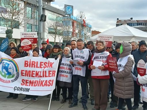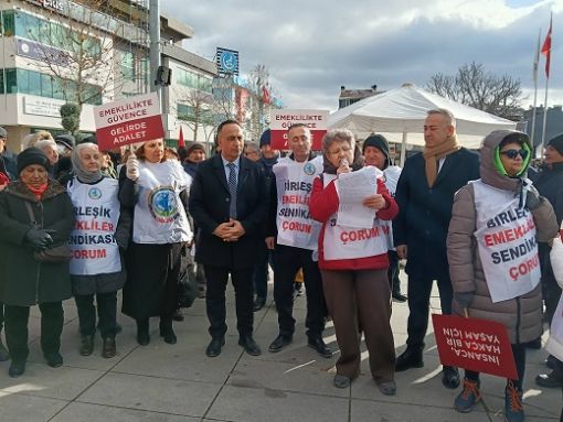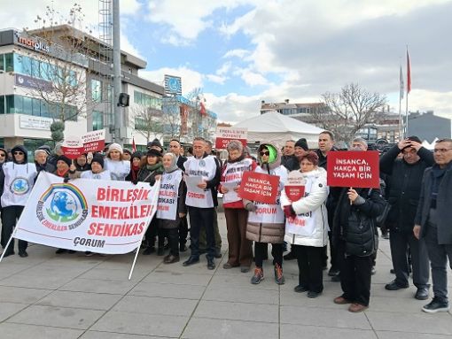 - Çorum’da alanlara inen emekliler, sorun ve taleplerini gündeme getirerek, “sefalet ücretine hayır! İnsanca yaşayacak maaş istiyoruz” dedi.