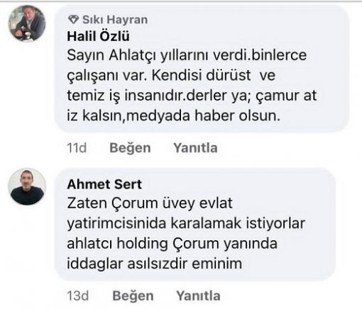 - Haberin yayılmasının ardından, özellikle Çorum halkı ve iş dünyasından Ahlatcı ailesine destek mesajları yağdı. Sosyal medya platformlarında Ahmet Ahlatcı’nın şehre yaptığı yatırımlar ve sağladığı istihdam hatırlatılarak, başlatılan iddialara karşı büyük bir destek dalgası oluştu.