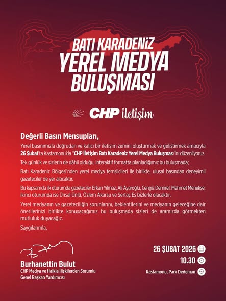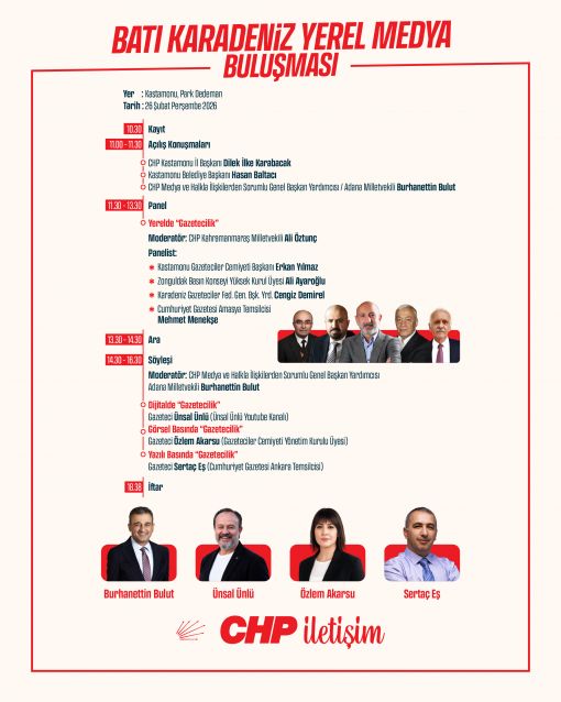 - CHP İletişim Başkanlığı tarafından daha önce Tekirdağ, İzmir ve Antalya'da düzenlenen Yerel Medya Buluşmaları'nın dördüncüsü 26 Şubat Perşembe günü Kastamonu'da gerçekleştirilecek.