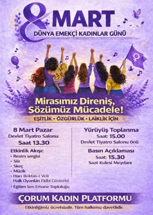 - 8 Mart Dünya Emekçiler Günü, Çorum'da da çeşitli etkinlikler düzenlenecek. Çorum Kadın Platformu Sözcüsü Eylem Kandemir, etkinlikler öncesi yaptığı açıklamada; 'Çorum Kadın Platformu olarak, 8 Mart Dünya Emekçi Kadınlar Gününde emeğimizi, sesimizi ve dayanışmamızı büyütmeye devam ediyor 8 Mart Pazar günü hep birlikte güzel bir etkinlik ile biraya geliyoruz.' ifadesinde bulundu.
