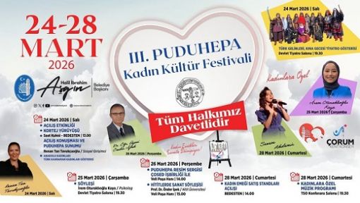 Çorum Belediyesi tarafından bu yıl üçüncüsü düzenlenen Puduhepa Kadın Kültür Festivali, 24-28 Mart 2026 tarihleri arasında çeşitli etkinliklerle gerçekleştirilecek. Dünya Kadınlar Günü kapsamında organize edilen festival, kültür, sanat ve kadın emeğini ön plana çıkaran birçok programa ev sahipliği yapacak. Festival, 24 Mart Salı günü Saat Kulesi’nden başlayacak kortej yürüyüşüyle başlayacak. Yürüyüşün ardından saat 13.00’te Bedesten’de açılış programı düzenlenecek. Açılışta sosyal girişimci Renan Tan Tavukçuoğlu “Puduhepa” sunumunu gerçekleştirecek. Ayrıca Anadolu’nun kahraman kadınlarını anlatan özel bir gösteri sahnelenecek. Aynı gün saat 19.30’da Devlet Tiyatro Salonu’nda Türk gelinleri ve kına gecesi temalı tiyatro gösterisi izleyiciyle buluşacak.Festival kapsamında 25 Mart Çarşamba günü Psikolog İrem Otaraklıoğlu Kaya, Devlet Tiyatro Salonu’nda saat 19.30’da söyleşi gerçekleştirecek.